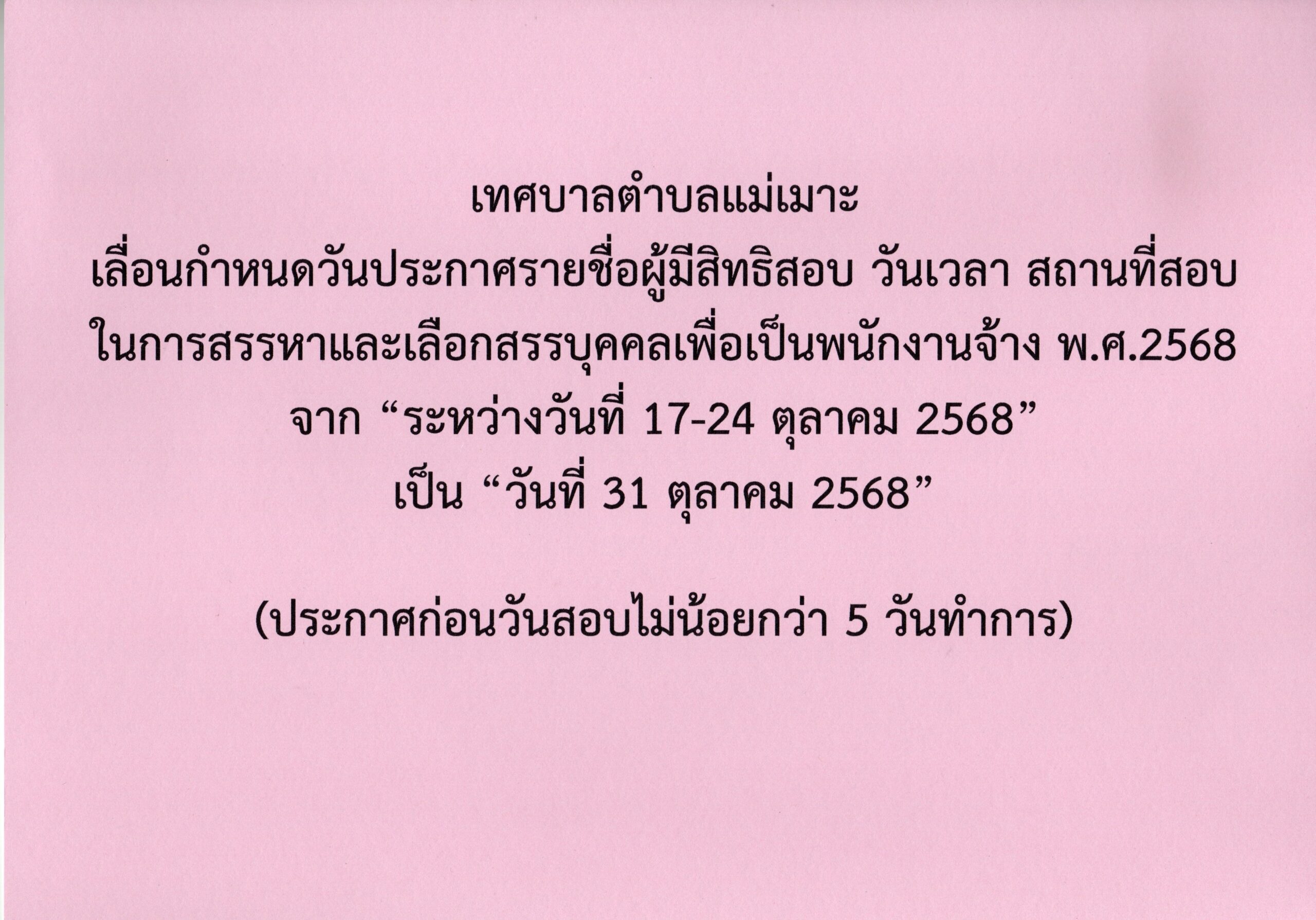 ประกาศเทศบาลตำบลแม่เมาะ เรื่อง เลื่อนกำหนดวันประกาศรายชื่อผู้มีสิทธิสอบ วันเวลา สถานที่สอบ ในการสรรหาและเลือกสรรบุคคลเพื่อเป็นพนักงานจ้าง พ.ศ.2568 22/10/256822/10/2025 admin Post Views: 13 FacebookFacebookXXLINELine