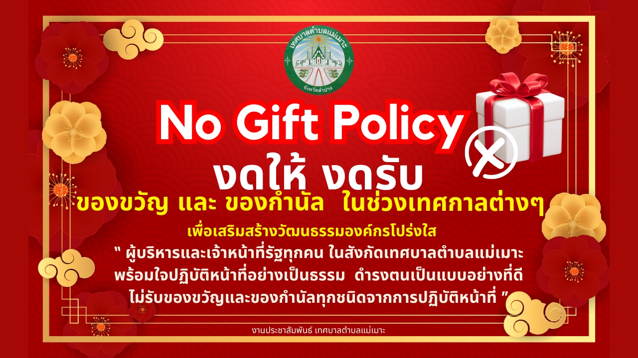 เทศบาลตำบลแม่เมาะ ประกาศ ! นโยบายการไม่รับของขวัญและของกำนัลทุกชนิดจากการปฏิบัติหน้าที่ ( No Gift Policy ) ประจำปีงบประมาณ พ.ศ.2569
