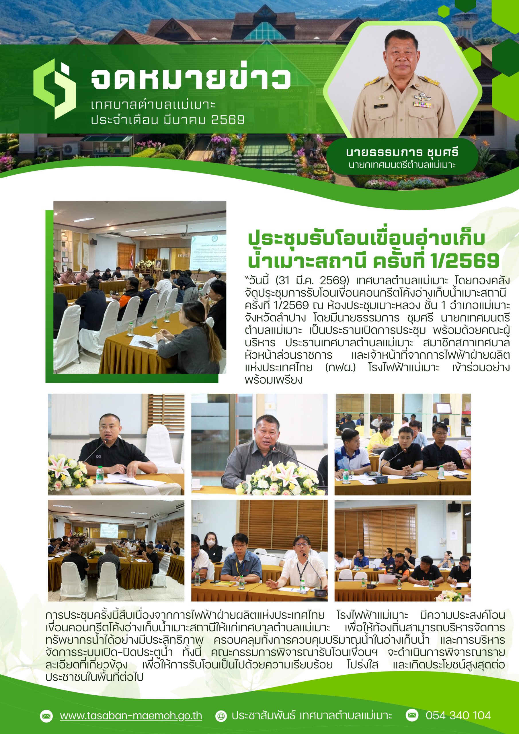 วันนี้ ( 31 มีนาคม 2569) เทศบาลตำบลแม่เมาะ โดยกองคลัง จัดประชุมการรับโอนเขื่อนคอนกรีตโค้งอ่างเก็บน้ำเมาะสถานี ครั้งที่ 1/2569 ณ ห้องประชุมเมาะหลวง ชั้น 1 อำเภอแม่เมาะ จังหวัดลำปาง โดยมีนายธรรมการ ชุมศรี นายกเทศมนตรีตำบลแม่เมาะ เป็นประธานเปิดการประชุม พร้อมด้วยคณะผู้บริหาร ประธานสภาเทศบาลตำบลแม่เมาะ สมาชิกสภาเทศบาล หัวหน้าส่วนราชการ และเจ้าหน้าที่จากการไฟฟ้าฝ่ายผลิตแห่งประเทศไทย (กฟผ.) โรงไฟฟ้าแม่เมาะ เข้าร่วมอย่างพร้อมเพรียง 🤝