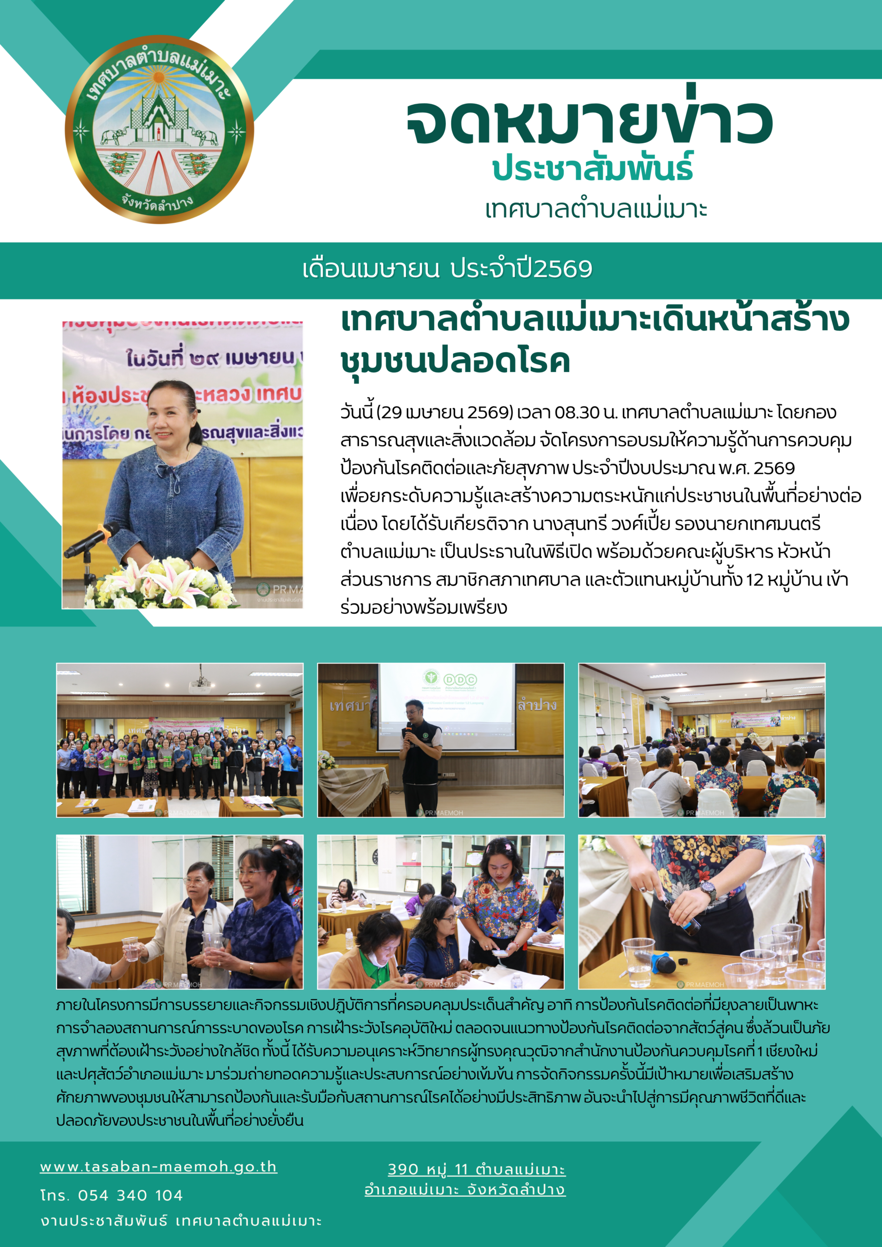วันนี้ (29 เมษายน 2569) เวลา 08.30 น. เทศบาลตำบลแม่เมาะ โดยกองสาธารณสุขและสิ่งแวดล้อม จัดโครงการอบรมให้ความรู้ด้านการควบคุม ป้องกันโรคติดต่อและภัยสุขภาพ ประจำปีงบประมาณ พ.ศ. 2569 เพื่อยกระดับความรู้และสร้างความตระหนักแก่ประชาชนในพื้นที่อย่างต่อเนื่อง